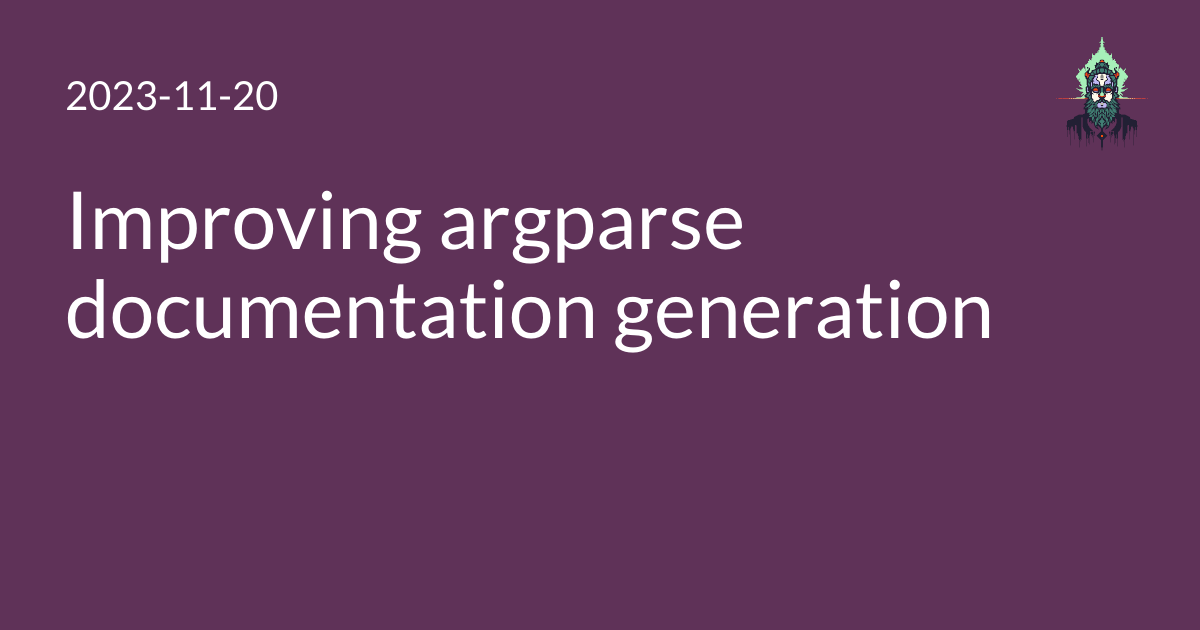 make_parser()has to be public now, because it will be called outside of this file.make_parser()now takes aprognameargument. This is normally not necessary for argparse programs, but argparse gets confused when run by cog and thinks that the program name iscog, so we have to allow an override.- Text wrapping is simpler per above.