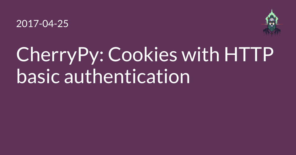 before_handler), and you must not enable Basic Authentication in the CherryPy config (that is, you shouldn’t do anything liketools.auth.onortools.auth.basic...etc) - you have to handle HTTP Basic Authentication yourself. The reason for this is that if you enable the built-in Basic Authentication stuff, it will do that auth check before it checks the session, and your cookies will do nothing.My solution, in prose
