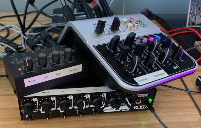 Two mixers, a headphone amp, and a mess of cables