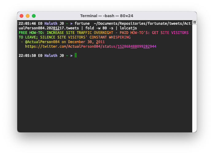 However, I didn’t want to copy all their tweets and put them up on GitHub – they might not want me to do that, and besides, any fortune database I made this way would be instantly obsolete.
