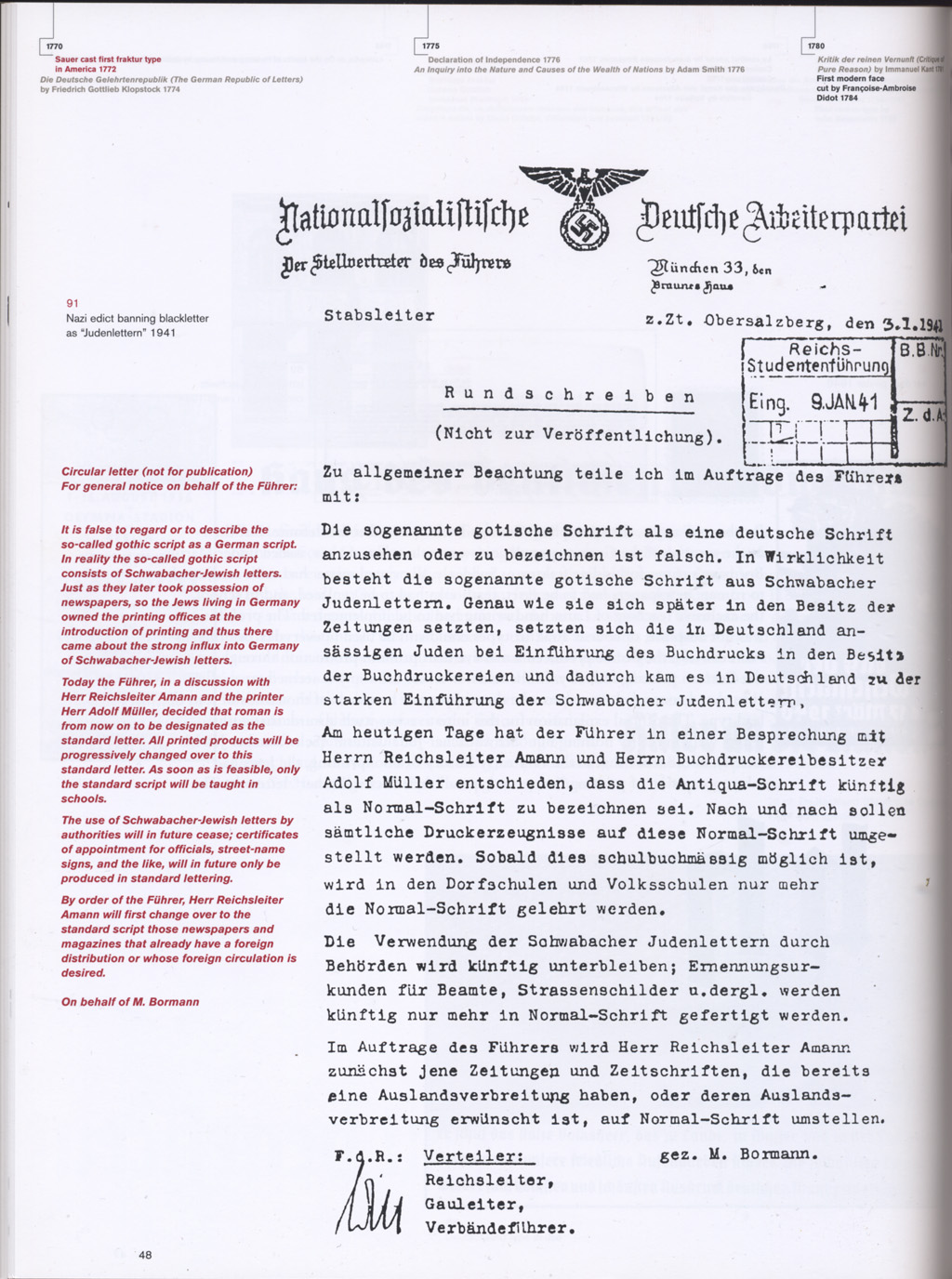 I would like to thank Frau Franziska Kaiser for finding me (after many attempts) a copy of the official order of the German Nazist Party, abolishing Fraktur and Schwabacher from all printed items. The argumentation given is typical of the Nazist Party (antisemitic and illogical).... Rather a sad way for such a beautiful type to die, especially if one considers all the masterpieces of the first centuries of typography!