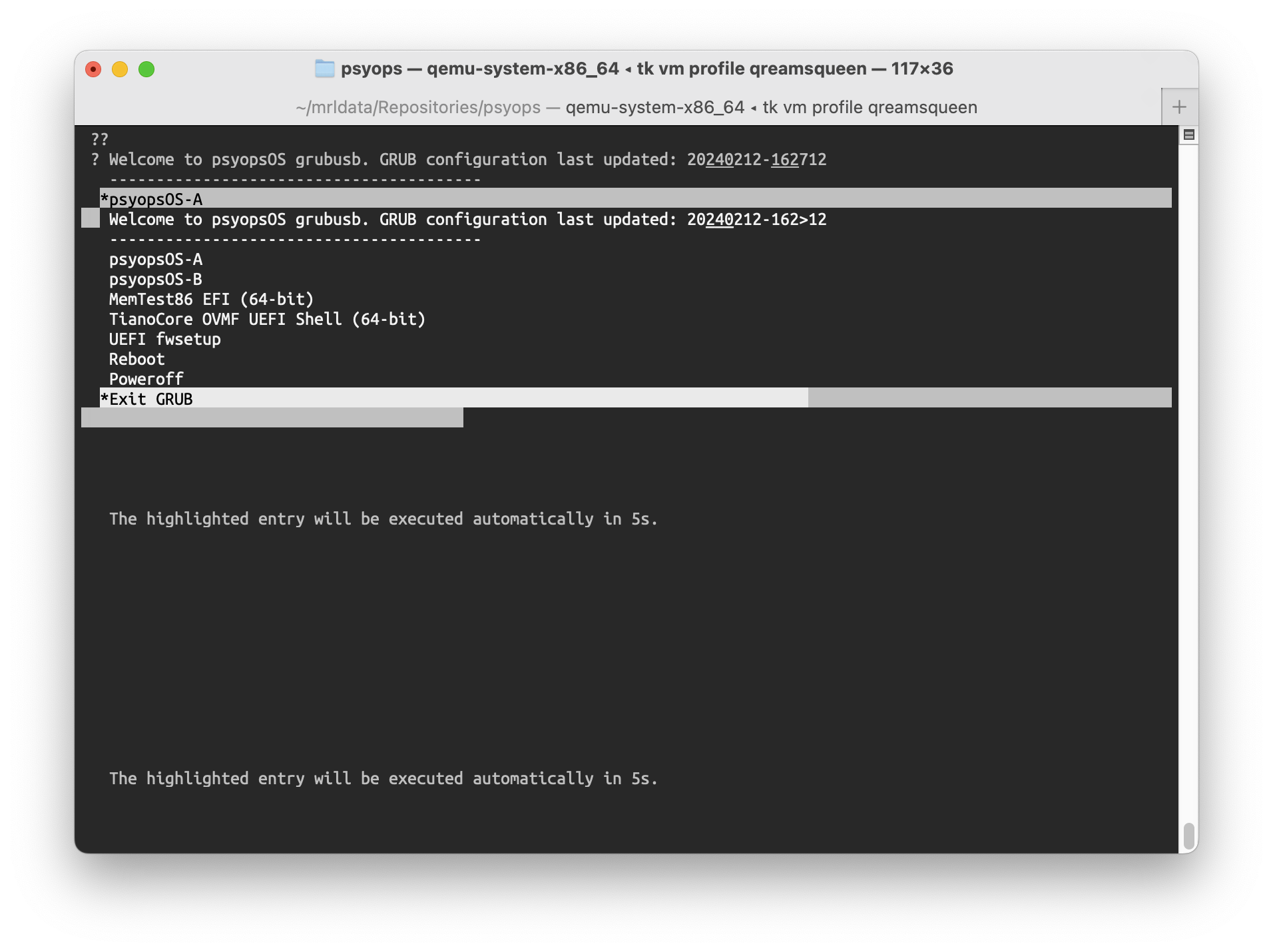It boots one of the psyopsOS-A and psyopsOS-B partitions – this allows a booted operating system to update the other side without disruption. It also offers some tools like memtest and the UEFI shell.