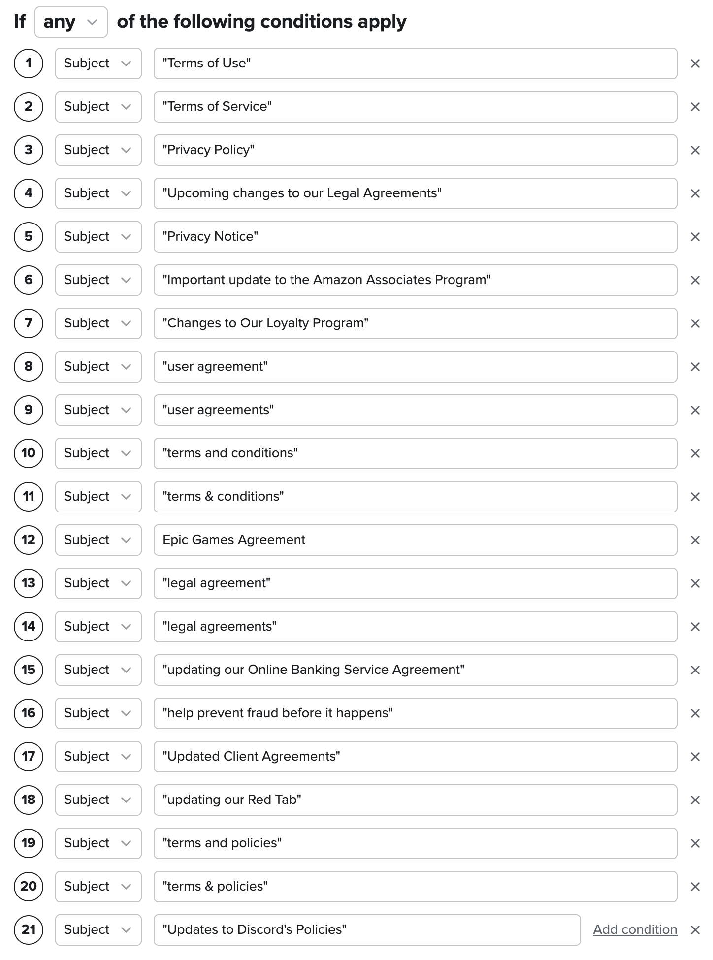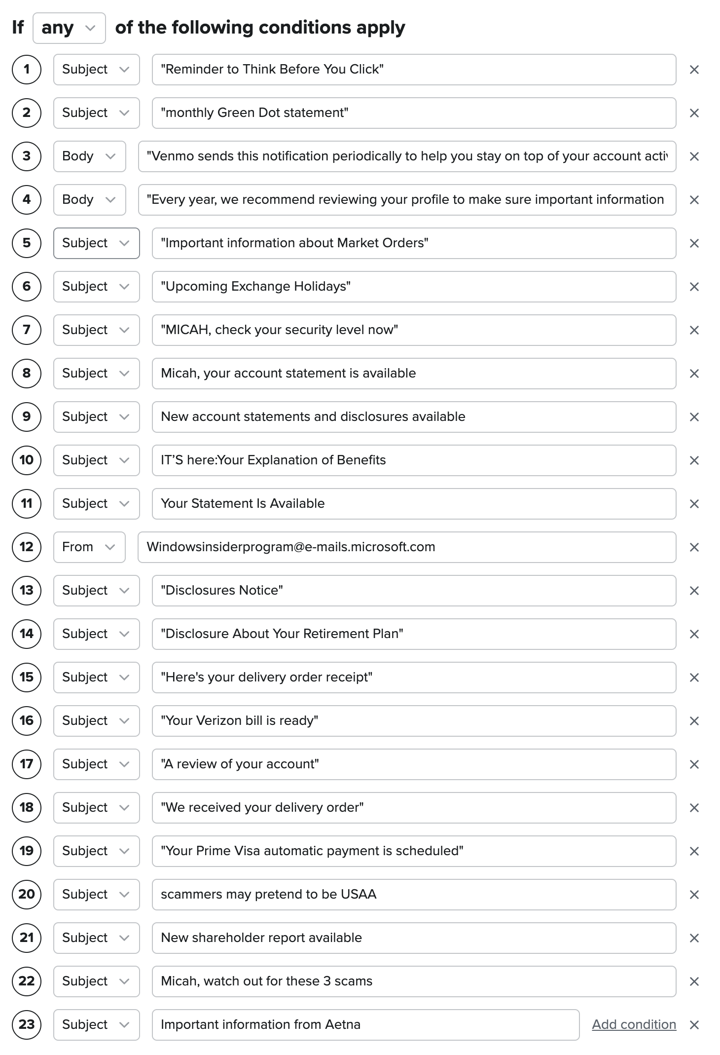 Categorization by computer saves precious human attention. Anything that doesn’t require an action should be filtered out or deleted. You can create long filters that relegate messages like terms of service updates, receipts, paperless billing statements, and delivery order notifications into a folder that you never need to see (unless you’re looking for it). You control where these needy messages go, and they can’t do anything about it.