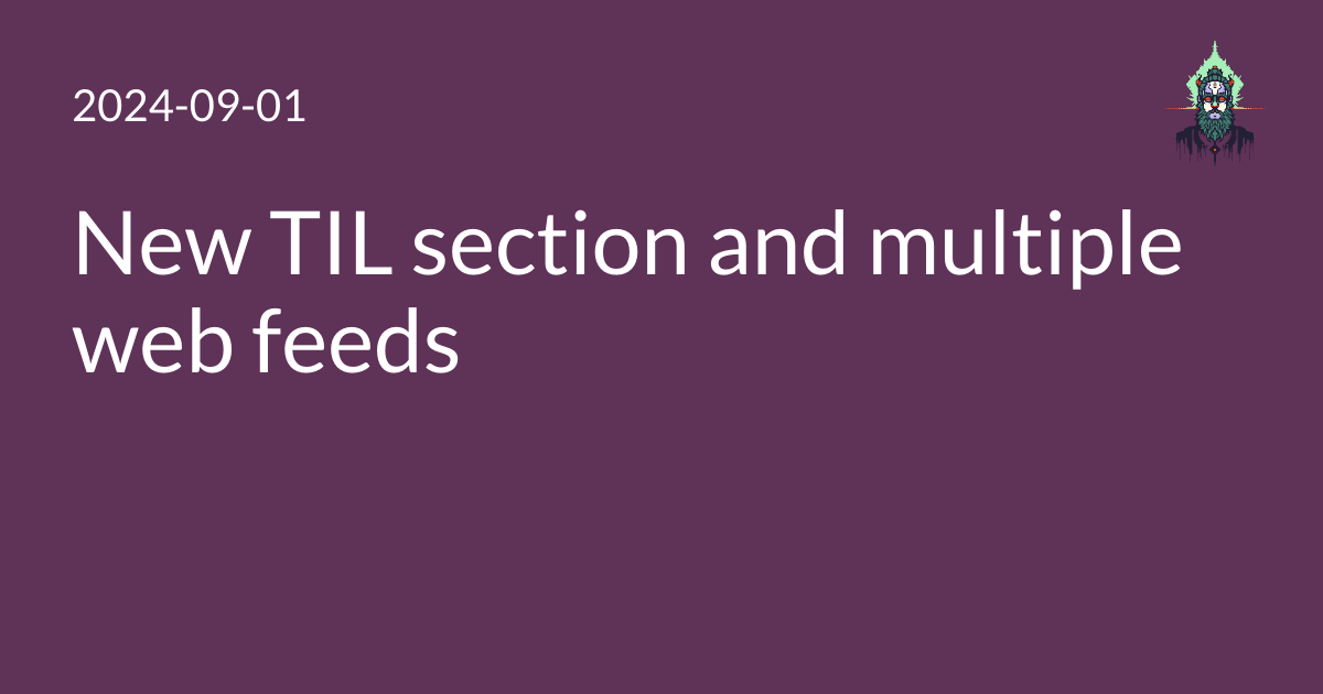 I’ve added a new chronological TIL section. It has its own web feed, which means that this blog’s feed is no longer the only feed on the site. The subscribe page will always have a comprehensive list of feeds, and any decent feed reader should be able to find all the site’s feeds from any page.