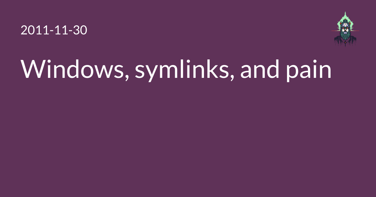 First problem: The only damn interface for this is a cmd.exe builtin. That’s right, mklink isn’t an executable, and there ain’t no other way to make a link without third-party tools. If you want to do it from, say, PowerShell, you have to do something stupid like add this to your PowerShell Profile: