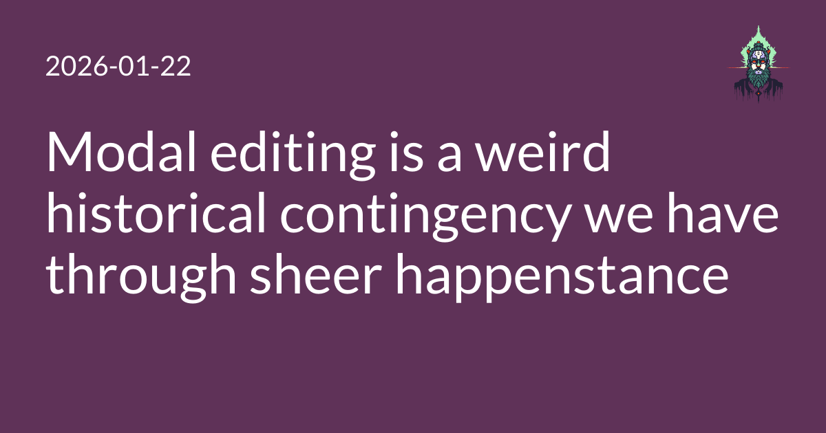 Vim is now very popular and has spawned numerous successors. But its key feature, modes, is not obviously-beneficial, to the point that if Bill Joy didn’t make vi (vim’s direct predecessor) fifty years ago I don’t think we’d have any modal editors today.