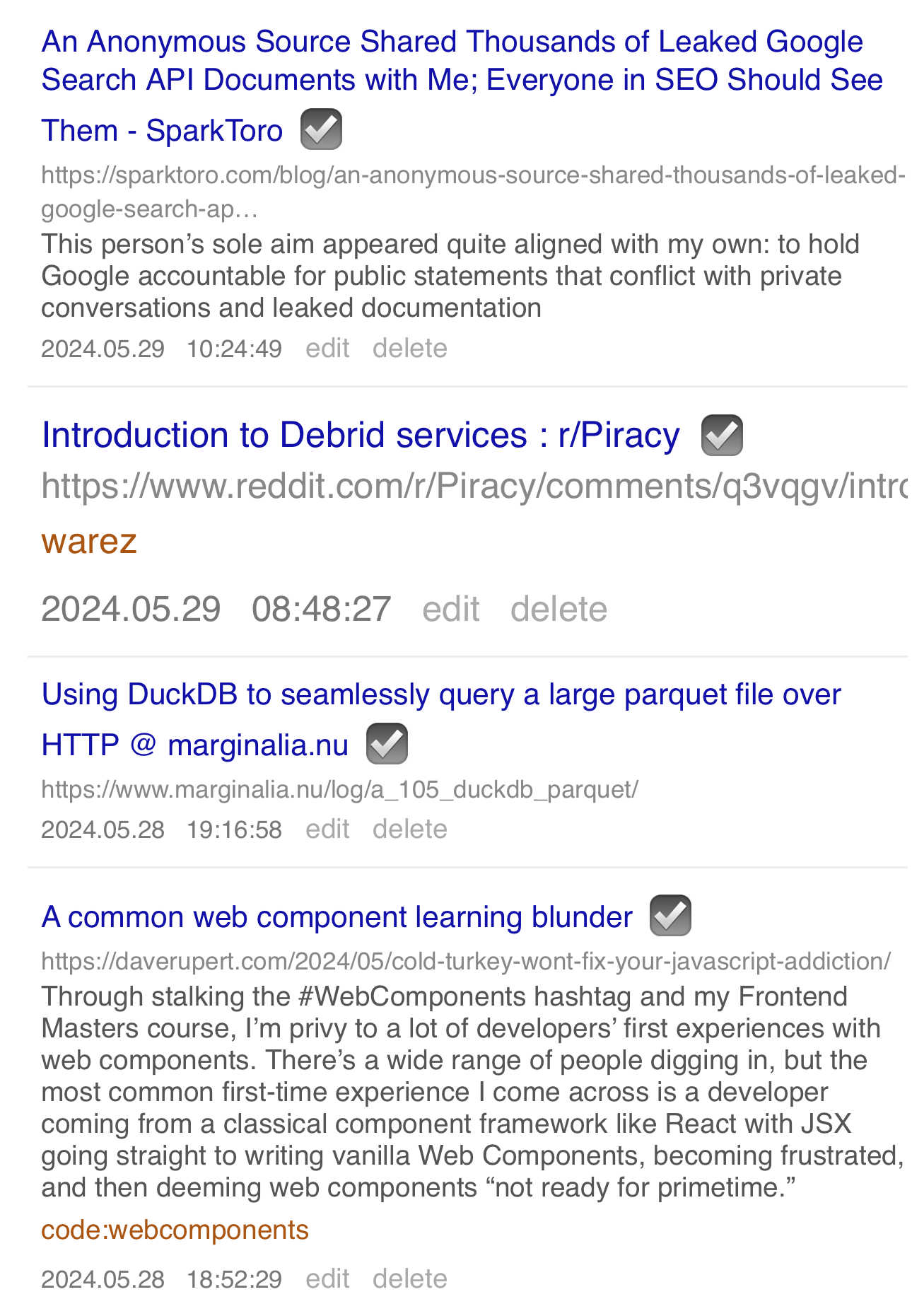 To be clear, I don’t mean to shame the examples I list above (well, except maybe Pinboard, which I did notify about the problem). For one thing, my site was published like this for weeks/months before I noticed and several days before I figured out how to fix it. I just think it’s easier to see by example, and I think it’s worth noting that people do trip over this pothole in practice.
